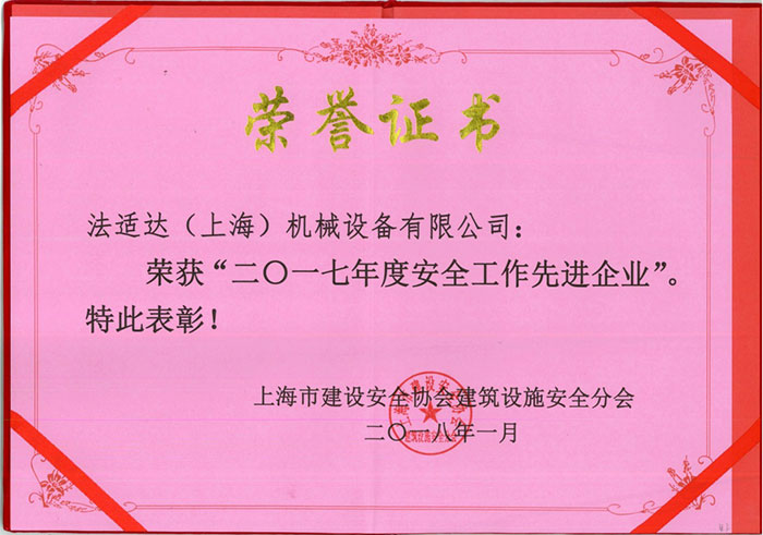 榮獲市“2017年度安全工作先進(jìn)企業(yè)” 時(shí) 間:2018-01-18 22:10:43 瀏覽次數(shù):7260 法適達(dá)榮獲由上海市建設(shè)安全協(xié)會(huì)建筑設(shè)施安全分會(huì)頒發(fā)的“2017年度安全工作先進(jìn)企業(yè)”。